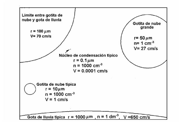 Tamaños comparativos de gotas,gotitas y partículas.También aparece la velocidad a la que se mueven. Fuente: Rutledge y Hobbs,1984.